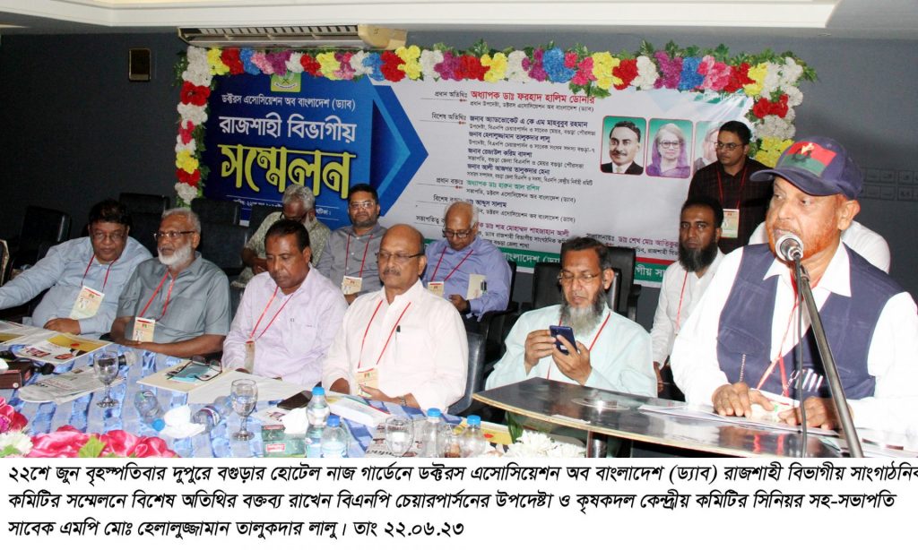 তারা সময় পেলে দেশের অস্তিত্ব বিলীন করে দেবে। তাই রাজপথে নেমে সরকারের পতন ঘটাতে হবে। সবাই রাজপথে নেমে সরকারকে বিদায় করে গণতন্ত্র ফিরিয়ে আনা হবে। এমন কোন সেক্টর নেই যেখানে দূর্নীতি নেই। সরকার স্বাস্থ্য খাতকে শেষ করে দিয়েছে। সরকারের পতন ঘটানো হোক আজকের শপথ। ডক্টরস এসোসিয়েশন অব বাংলাদেশ (ড্যাব) রাজশাহী বিভাগীয় সাংগাঠনিক কমিটির সম্মেলনে বিশেষ অতিথির বক্তব্য রাখেন বিএনপি চেয়ারপারসনের উপদেষ্টা অ্যাডভোকেট একেএম মাহবুবর রহমান, বিএনপি চেয়ারপার্সনের উপদেষ্টা ও কৃষকদল কেন্দ্রীয় কমিটির সিনিয়র সহ-সভাপতি সাবেক এমপি মোঃ হেলালুজ্জামান তালুকদার লালু, বগুড়া জেলা বিএনপির সভাপতি ও পৌর মেয়র রেজাউল করিম বাদশা, বগুড়া জেলা বিএনপির সাধারন সম্পাদক আলী আজগর তালুকদার হেনা। প্রধান বক্তার বক্তব্য রাখেন ডক্টরস এসোসিয়েশন অব বাংলাদেশ (ড্যাব) কেন্দ্রীয় সভাপতি অধ্যাপক ডাঃ হারুন আল রশিদ, বিশেষ বক্তার বক্তব্য রাখেন ডক্টরস এসোসিয়েশন অব বাংলাদেশ (ড্যাব) কেন্দ্রীয় মহাসচিব ডাঃ মোঃ আব্দুস সালাম। বিভাগীয় কমিটির সদস্য সচিব ডাঃ শেখ মোহাম্মাদ আতিকুর রহমান সুজনের পরিচালনায় আরো বক্তব্য দেন ড্যাবের কেন্দ্রীয় নেতা ডাঃ জহরুল ইসলাম শাকিল, ডাঃ মেহেদী হাসান, ডাঃ মোস্তাক রহিম স্বপন, ডাঃ মওদুদ হোসেন আলমগীর পাভেল, ডাঃ মইনুল হাসান সাদিক, ডাঃ আজফারুল হাবিব রোজ, ডাঃ ফারুক হোসেন, ডাঃ শহীদ হোসেন, ডাঃ পারভেজ রেজা, ডাঃ জিয়া, ডাঃ বিটু, ডাঃ মুকুল, ডাঃ মামুনুর রশীদ মিটু, ডাঃ মোঃ ইউনুস আলী, স্থানীয় নেতা ডাঃ মুনছুর রহমান, ডাঃ আব্দুল লতিফ, ডাঃ আব্দুল আলিম, ডাঃ একেএম মইনুল হাসান রাব্বী প্রমুখ। অন্যান্য ব্ক্তা বলেন, গত ১৫ বছর স্বাস্থ্য খাতে ভয়াবহ দূর্নীতি হয়েছে। শুধুমাত্র ড্যাব করার কারনে সারাদেশে দুইশত ডাক্তারকে সরকারী চাকুরী হারাতে হয়েছে। এ ছাড়া তাদের সন্তানদেরও চাকুরী দেয়া হয় না। সরকার মেডিকেল শিক্ষা ব্যবস্থাও ধ্বংস করেছে। এখন নিম্ম মানের ডাক্তার বেরিয়ে আসছে। ছাত্রলীগ নেতাদের আলাদা করে পরীক্ষা নিয়ে ডাক্তারী পাশ করে দেয়া হচ্ছে। এটা জাতির জন্য অশনি সংকেত। সম্মেলনে রাজশাহী বিভাগের প্রত্যেক জেলা থেকে ডাক্তাররা অংশ গ্রহন করেন।