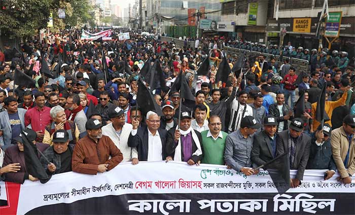 বিএনপির স্থায়ী কমিটির সদস্য গয়েশ্বর চন্দ্র রায় বলেছেন, এই সরকার জনগণের সরকার নয়, এই সরকার ভারত, চীন, রাশিয়ার সরকার। তাই এই আমরা এই সরকারকে মানতে বাধ্য নই। তিনি বলেন, ৭ই জানুয়ারি মানুষ ভোটকেন্দ্রে যায় নাই। ৭ শতাংশের বেশি মানুষ ভোট দেয়নি। শেখ হাসিনা দেশের ৭ ভাগ মানুষের প্রতিনিধিত্ব করছেন। আর তারেক রহমান ৯৩ শতাংশ মানুষের নেতৃত্ব দিচ্ছেন। আজ বিকালে নয়াপল্টনে বিএনপির কেন্দ্রীয় কার্যালয়ের সামনে কালো পতাকা মিছিল শুরুর আগে সংক্ষিপ্ত সমাবেশে প্রধান অতিথির বক্তব্যে এসব কথা বলেন তিনি। দ্রব্যমূল্যের ঊর্ধ্বগতির প্রতিবাদ, দ্বাদশ সংসদ নির্বাচন বাতিল, গ্রেপ্তারকৃত নেতাকর্মীদের মুক্তিসহ এক দফা দাবিতে এই কালো পতাকা মিছিলের আয়োজন করে বিএনপি। গত ৭ জানুয়ারি নির্বাচনের পর এটাই বিএনপির বড় কর্মসূচি। এসময় নতুন কর্মসূচি ঘোষণা করেন গয়েশ্বর রায়। তিনি বলেন, অবৈধ ডামি সংসদ বাতিল, নির্দলীয় নিরপেক্ষ তত্ত্বাবধায়ক সরকারের অধীনে জাতীয় সংসদের নির্বাচনের দাবিতে আগামী ৩০ জানুয়ারি দেশের সকল মহানগর, থানা, জেলা, সদর, সকল উপজেলায় এবং সকল পৌরসভায় বিএনপির উদ্যোগে কালো পতাকা মিছিল অনুষ্ঠিত হবে। বক্তব্য শেষে কালো পতাকা মিছিলের উদ্বোধন করেন গয়েশ্বর রায়। মিছিলটি নয়াপল্টন কার্যালয়ের সামনে থেকে শুরু হয়ে নাইটিঙ্গেল মোড় হয়ে ফকিরাপুল, আরামবাগ মোড় ঘুরে নয়াপল্টনে এসে শেষ হয়।
