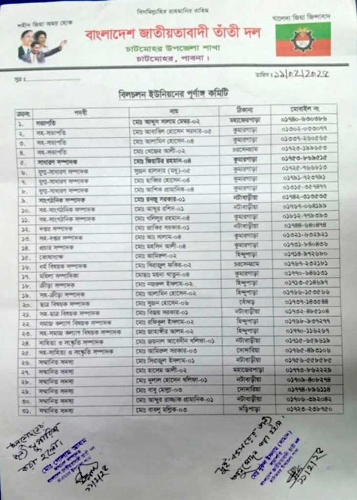 শাহীন রহমান, পাবনা: আব্দুস সালাম ছিলেন কৃষক লীগ পাবনার চাটমোহর উপজেলা কমিটির সদস্য। পট পরিবর্তনের পর কৃষক লীগ থেকে জাতীয়তাবাদী তাঁতী দলের বিলচলন ইউনিয়ন কমিটির সভাপতি হয়েছেন তিনি। সম্প্রতি এমন ঘটনা ঘটেছে পাবনার চাটমোহর উপজেলায়। এ নিয়ে সামাজিক যোগাযোগ মাধ্যমে চলছে সমালোচনার ঝড়। অভিযুক্ত সালামের বাড়ি চাটমোহর উপজেলার বিলচলন ইউনিয়নের উত্তরসেনগ্রামে। তিনি বিলচলন ইউনিয়নের ২ নাম্বার ওয়ার্ড এর মেম্বার। কৃষক লীগ ও তাঁতী দলের অনুমোদিত কমিটির কাগজপত্র পর্যালোচনা করে দেখা যায়, ২০২৩ সালের ২১ সেপ্টেম্বর পাবনা জেলা কৃষক লীগের সভাপতি, সাধারণ সম্পাদক চাটমোহর উপজেলা কৃষক লীগের কমিটি অনুমোদন করেন। সেই কমিটির ৬৯ নাম্বার সদস্য ছিলেন আব্দুস সালাম। এদিকে, চলতি বছরের গত ১১ ফেব্রুয়ারি জাতীয়তাবাদী তাঁতী দল বিলচলন ইউনিয়ন শাখার কমিটি অনুমোদন দেয়া হয়েছে। তাঁতী দল চাটমোহর উপজেলা শাখার সভাপতি নুরুল ইসলাম (সামাদ) ও সাধারণ সম্পাদক গোলাম আযম স্বাক্ষরে অনুমোদনকৃত কমিটিতে সভাপতি হয়েছেন সেই আব্দুস সালাম।