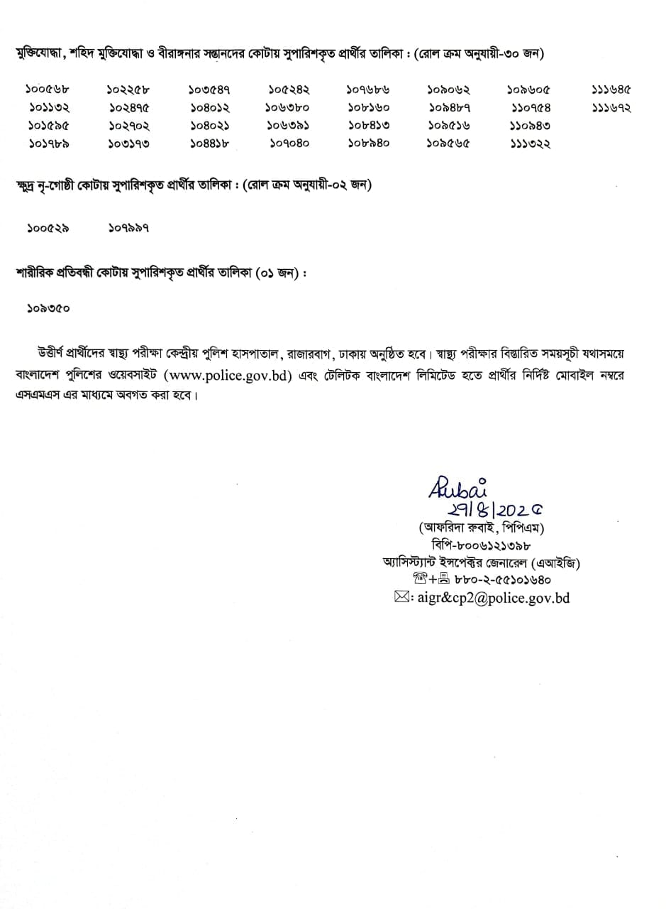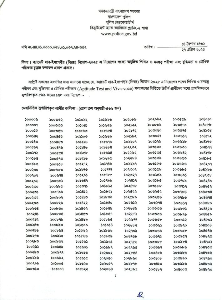 বাংলাদেশ পুলিশের ক্যাডেট সাব-ইন্সপেক্টর (নিরস্ত্র) নিয়োগ- ২০২৫ এর ফলাফল প্রকাশ হয়েছে। রোববার বিকালে এক বিজ্ঞপ্তিতে জানানো হয়েছে এ তথ্য। বিজ্ঞপ্তিতে বলা হয়েছে, বাংলাদেশ পুলিশের ক্যাডেট সাব-ইন্সপেক্টর (নিরস্ত্র) নিয়োগ-২০২৫ এ নিয়োগের লক্ষ্যে লিখিত ও মনস্তত্ত্ব পরীক্ষা এবং বুদ্ধিমত্তা ও মৌখিক পরীক্ষার ফলাফলের ভিত্তিতে উত্তীর্ণ প্রার্থীদের মধ্যে প্রাথমিকভাবে সুপারিশকৃত প্রার্থীদের রোল নম্বর প্রকাশ করা হল। প্রকাশিত ফলাফলে দেখা গেছে, এ বছর মোট ৫৯৯ প্রার্থীকে প্রাথমিকবভাবে সুপারিশ করা হয়েছে। এদের মধ্যে মেধাভিত্তিক ৫৬৬ জন, মুক্তিযোদ্ধা কোটা ৩০ জন, ক্ষুদ্র-নৃগোষ্ঠী কোটায় ২ জন এবং শারীরিক প্রতিবন্ধী কোটা ১ জনকে সুপারশি করা হয়েছে। সুপারিশকৃত প্রার্থীদের স্বাস্থ্য পরীক্ষা রাজধানীর রাজারবাগে কেন্দ্রীয় পুলিশ হাসপাতালে হবে। এ পরীক্ষার বিস্তারিত সময়সূচি বাংলাদেশ পুলিশের অফিশিয়াল ওয়েবসাইটে (www.police.gov.bd) এবং টেলিটক বাংলাদেশ লিমিটেড থেকে প্রার্থীদের নির্দিষ্ট ফোন নম্বরে এসএমএসের মাধ্যমে জানিয়ে দেওয়া হবে।