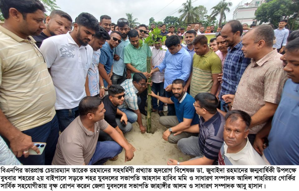 বিএনপির ভারপ্রাপ্ত চেয়ারম্যান তারেক রহমানের সহধর্মিণী প্রখ্যাত হৃদরোগ বিশেষজ্ঞ ডা. জুবাইদা রহমানের জন্মবার্ষিকীতে বগুড়ায় বৃক্ষরোপণ। ১৮ জুন বুধবার সকাল সাড়ে ১০টায় পরিবার বর্গের আয়োজনে বৃক্ষরোপণ কর্মসূচীর শুরুতে বায়তুর রহমান সেন্ট্রাল মসজিদ চত্বরে নিম গাছের চারা রোপণ করা হয়। পরে আলতাফুনেছার খেলার মাঠ ও শহরতলী শাকপালা ওয়ার্কিং পার্কে এই বৃক্ষ রোপণ করেন বিএনপি চেয়ারপার্সনের উপদেষ্টা ও কৃষকদল কেন্দ্রীয় কমিটির সিনিয়র সহ-সভাপতি এবং সাবেক এমপি মোঃ হেলালুজ্জামান তালুকদার লালু ও বগুড়া জেলা বিএনপির সভাপতি রেজাউল করিম বাদশা। এসময় উপস্থিত ছিলেন বিএনপির জাতীয় নির্বাহী কমিটির সদস্য ভিপি সাইফুল ইসলাম, জয়নাল আবেদীন চান, বিএনপি নেতা ফজলুল বারী তালুকদার বেলাল, জেলা বিএনপির সহ-সভাপতি এড. হামিদুল হক চৌধুরী হিরু, সিনিয়র যুগ্ম সাধারণ সম্পাদক তৌহিদুল আলম মামুন, জেলা ড্যাবের সাবেক সভাপতি ডা: শাহ মো: শাজাহান আলী, বিএনপি মিডিয়া সেলের রাজশাহী ও রংপুর বিভাগের সমন্বকারী সাংবাদিক কালাম আজাদ, জেলা যুবদলের সভাপতি জাহাঙ্গীর আলম, সাধারণ সম্পাদক আবু হাসান, জেলা মহিলা দলের সাধারণ সম্পাদক নাজমা আকতার, জেলা স্বেচ্ছাসেবকদলের সভাপতি সরকার মুকুল, সাধারণ সম্পাদক রাকিবুল ইসলাম শুভ, জেলা ছাত্রদলের সভাপতি হাবিবুর রশিদ সন্ধান। পরিবারের পক্ষে ছিলেন সৈয়দ আমিনুল হক দেওয়ান সজল, সাইদুজ্জামান শাকিল, আব্দুল গফুর দারা, শামীম, রাকিবুল ইসলাম শুভ আল-আমিন ও উজ্জ্বল।