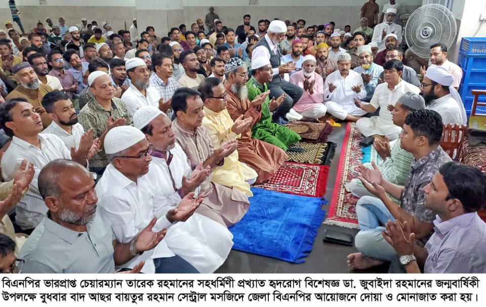 আপরদিকে জেলা যুবদল, জেলা স্বেচ্ছসেবকদল, জেলা ছাত্রদল ও শহর যুবদল শহরের বিভিন্ন স্কুলমাঠে ঈদগাহ ময়দানে, পার্কে বৃক্ষরোপণ করেন। এদিকে বাদ আছর বায়তুর রহমান সেন্ট্রাল মসজিদের বগুড়া জেলা বিএনপির আয়োজনে দোয়া মাহফিল অনুষ্ঠিত হয়। এসময় উপস্থিত ছিলেন লন বিএনপি চেয়ারপারসনের উপদেষ্টা ও বগুড়া পৌরসভা সাবেক মেয়র এ্যাড. একেএম মাহবুবর রহমান, বিএনপি চেয়রপার্সনের উপদেষ্ঠা ও কৃষকদলের কেন্দ্রীয় কমিটির সিনিয়র সহ-সভাপতি সাবেক এমপি মোঃ হেলালুজ্জামান তালুকদার লালু, বগুড়া জেলা বিএনপির সভাপতি রেজাউল করিম বাদশা, বিএনপির কেন্দ্রীয় কমিটির সদস্য আলী আজগর তালুকদার হেনা, বিএনপির জাতীয় নির্বাহী কমিটির সদস্য ভিপি সাইফুল ইসলাম, জয়নাল আবেদীন চান, জেলা বিএনপির সহ-সভাপতি এম আর ইসলাম স্বাধীন, মাফতুন আহমেদ খান রুবেল, জেলা ড্যাবের সাবেক সভাপতি ডা: শাহ মো: শাজাহান আলী, জেলা বিএনপির সাংগঠনিক সম্পাদক শহিদ উন নবী সালাম, কেএম খায়রুল বাশার, যুগ্ম সম্পাদক শেখ তাহাউদ্দিন নাহিন, শাহাদত হোসেন, জেলা স্বেচ্ছাসেবকদলের সভাপতি সরকার মুকুল, জেলা ছাত্রদলে সভাপতি হাবিবুর রশিদ সন্ধান সরকারসহ বিএনপির নেতৃবৃন্দ। দোয়া পরিচালনা করেন বায়তুর রহমান সেন্ট্রাল মসজিদের ইমাম মাওলানা মোহাম্মদ আব্দুল্লাহ।