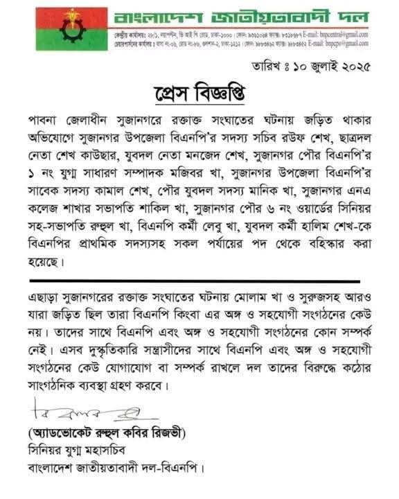 পাবনা প্রতিনিধি: পাবনার সুজানগরে মোবাইলে কথা বলাকে কেন্দ্র করে বিএনপির দুই গ্রুপের মধ্যে সংঘর্ষের ঘটনায় ১৫ জন আহতের ঘটনায় গুরুতর আহত উপজেলা বিএনপির সদস্য সচিব শেখ আব্দুর রউফ সহ ১০ নেতাকে বহিষ্কার করা হয়েছে। বৃহস্পতিবার (১০ জুলাই) রাতে বিএনপির যুগ্ম মহাসচিব এডভোকেট রুহুল কবির রিজভী সাক্ষরিত এক প্রেস নোটের মাধ্যমে তাদের বহিষ্কার করা হয়। শুক্রবার (১১ জুলাই) দুপুরে সুজানগর উপজেলা বিএনপির আহবায়ক তৌফিক হাসান আলহাজ্ব বিষয়টি নিশ্চিত করেছেন। বহিস্কৃতরা হলেন-সুজানগর উপজেলা বিএনপি’র সদস্য সচিব রউফ শেখ (৫২), ছাত্রদল নেতা শেখ কাউছার (২৮), যুবদল নেতা মনজেদ শেখ (৪৫), সুজানগর পৌর বিএনপি’র ১ নং যুগ্ম সাধারণ সম্পাদক মজিবর খা (৬০), সুজানগর উপজেলা বিএনপি’র সাবেক সদস্য কামাল শেখ (৪৬), পৌর যুবদল সদস্য মানিক খা (৩৮), সুজানগর এনএ কলেজ শাখার সভাপতি শাকিল খা (২৫), সুজানগর পৌর ৬ নং ওয়ার্ডের সিনিয়র সহ-সভাপতি রুহুল খা (৪০), বিএনপি কর্মী লেবু খা (৬০) ও যুবদল কর্মী হালিম শেখ (৪০)। প্রেস বিজ্ঞপ্তিতে উল্লেখ করা হয়েছে, পাবনা জেলাধীন সুজানগরে রক্তাক্ত সংঘাতের ঘটনায় জড়িত থাকার অভিযোগে এ সকল নেতাকর্মীকে বিএনপির প্রাথমিক সদস্যসহ সকল পর্যায়ের পদ থেকে বহিস্কার করা হয়েছে। এছাড়া সুজানগরের রক্তাক্ত সংঘাতের ঘটনায় মোলায়েম খা ও সুরুজসহ আরও যারা জড়িত ছিল তারা বিএনপি কিংবা এর অঙ্গ ও সহযোগী সংগঠনের কেউ নয়। তাদের সাথে বিএনপি এবং অঙ্গ ও সহযোগী সংগঠনের কোন সম্পর্ক নেই। এসব দুস্কৃতকারি সন্ত্রাসীদের সাথে বিএনপি এবং অঙ্গ ও সহযোগী সংগঠনের কেউ যোগাযোগ বা সম্পর্ক রাখলে দল তাদের বিরুদ্ধে কঠোর সাংগঠনিক ব্যবস্থা গ্রহণ করবে। সুজানগর উপজেলা বিএনপির আহবায়ক তৌফিক হাসান আলহাজ্ব বলেন, বহিষ্কারের বিষয়টি কেন্দ্র করেছে। গুরুতর আহত সদস্য সচিব শেখ আব্দুর রউফকে বহিষ্কারের বিষয়টি দু:খজনক বলে উল্লেখ করেন তিনি। সুজানগর থানার ভারপ্রাপ্ত কর্মকর্তা ওসি মজিবর রহমান বলেন, এখনো মামলা হয়নি। কেউ কোন অভিযোগ দেয়নি। গ্রেপ্তারও নেই। অভিযোগ দিলে ব্যবস্থা নেবে পুলিশ।