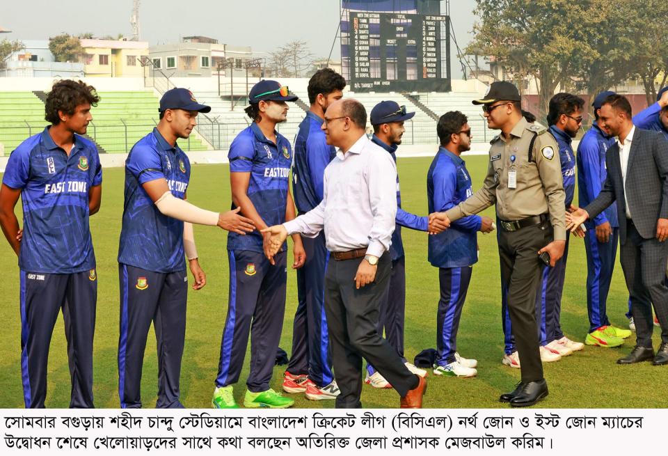 বাংলাদেশ ক্রিকেট লিগ (বিসিএল) এর ওয়ানডে টুর্ণামেন্টের উদ্বোধনী ম্যাচে বগুড়ায় দাপুটে জয় পেয়েছে তারকায় ভরা নর্থ জোন। বগুড়ার শহীদ চান্দু স্টেডিয়ামে ইষ্ট জোনের বিপক্ষে আগে ব্যাট করে আকবর আলীর দূর্দান্ত সেঞ্চুরীর পর রিশাদ হোসের ঘুর্ণিতে কাবু ইষ্ট জোন। ব্যাট-বলের অসাধারণ নৈপূণ্যের ম্যাচ অবশেষে নর্থ জোন জিতেছে ৫৪ রানে। নর্থ জোনের গড়া ৩৩৫ রানের জবাবে ইষ্ট জোন ২ বল বাকি থাকতে অল আউট হয়েছে ২৮১ রানে। বিজয়ী দলের আকবর আলী প্লেয়ার অব দ্য ম্যাচ নির্বাচিত হয়েছেন। সকালে ইষ্ট জোন টসে জিতে নর্থ জোনকে ব্যাট করতে পাঠায়। দলীয় ২০ রানে ওপেনার হাবিবুর রহমান সোহান সাজঘরে ফেরার পর আরেক ওপেনার তানজিদ হাসান তামিম এবং অধিনায়ক নাজমুল হোসেন শান্ত দলের ভীত রচনা করেন। দলীয় ১০২ রানে তানজিদ তামিম ব্যক্তিগত ৫৪ রানে আউট হলে অল্প রানের ব্যবধানে লিটন দাস এবং তাওহিদ হৃদয়কে হারিয়ে বিপাকে পড়ে নর্থ জোন। তবে, আকবর আলী এসে অধিনায়ক শান্তর সাথে শক্ত জুটি গড়ে দলের বিপর্যয় সামলে নেন। এই জুটিতে যোগ হয় ১২০ রান। অধিনায়ক শান্ত ব্যক্তিগত ৬৮ রান করে সাজঘরে ফিরলেও আকবর আলী তুলে নেন টুর্ণামেন্টের প্রথম সেঞ্চুরী। তিনি টি-টুয়েন্টি মুডে ব্যাট চালিয়ে ৮১ বলে ৮টি চার এবং ৫টি ছক্কার সাহায্যে সেঞ্চুরী পূর্ন করেন। শেষ পর্যন্ত ১১১ রান করে সাইফুদ্দিনের বলে এলবিডব্লিউ’র ফাঁদে পড়ার আগেই দলের স্কোর ৩’শ অতিক্রম করে। শেষ পর্যন্ত ৩৩৫ রানে শেষ হয় নর্থ জোনের ইনিংস। ইষ্ট জোনের খালেদ আহম্মেদ ৪ উইকেট নিয়েছেন। হাসান মাহমুদ এবং সাইফুদ্দিন ২টি করে উইকেট পেয়েছেন। ৩৩৬ রানের অনেক বড় টার্গেট তাড়া করতে নেমে শুরুতেই ওপেনার জাকিরকে হারায় ইষ্ট জোন। এরপর দলীয় ৬৯ রানের টপ অর্ডারের ৩ ব্যাটার সাজঘরে ফিরলে চাপে পড়ে ইষ্ট জোন। এমন কঠিন মুহুর্তে দলের হাল ধরেন অভিজ্ঞ মমিনুল হক এবং দলনেতা ইয়াছির আলী রাব্বী। এই জুটি দলকে ১৪০ রানের টেনে নিয়ে যান। ইয়াছির রাব্বী ব্যক্তিগত ৪২ রানে আউট হলেও মমিনুল খেলেছেন ৮২ রানের দূর্দান্ত ইনিংস।