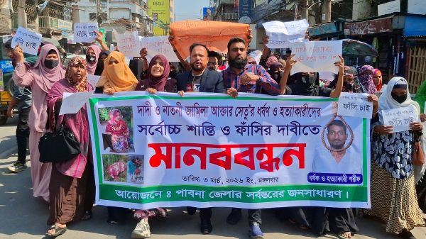পাবনা প্রতিনিধি: পাবনার ঈশ্বরদীতে দাদিকে হত্যার পর বাড়ি থেকে নাতনিকে অপহরণ করে ধর্ষণ ও হত্যায় জড়িত শরিফুলের ফাঁসির দাবিতে মানববন্ধন ও বিক্ষোভ অনুষ্ঠিত হয়েছে। মঙ্গলবার (৩ মার্চ) সকাল এগারোটার দিকে