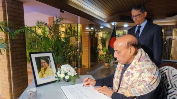 বিএনপি চেয়ারপারসন ও সাবেক প্রধানমন্ত্রী খালেদা জিয়ার জন্য ভারতের রাজধানী নয়াদিল্লিতে বাংলাদেশের হাইকমিশনে খোলা শোকবইতে স্বাক্ষর করেছেন দেশটির প্রতিরক্ষামন্ত্রী রাজনাথ সিং। বৃহস্পতিবার (১ জানুয়ারি) দুপুরে হাইকমিশনে যান রাজনাথ সিং। তিনি