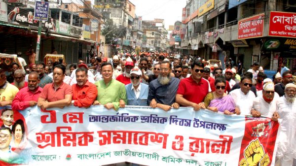 মহান মে দিবস উপলক্ষ্যে বগুড়ায় শ্রমিক দলের র্যালী ও সমাবেশ। মে দিবস ২০২৫-এর এবারের প্রতিপাদ্য- ‘শ্রমিক-মালিক এক হয়ে, গড়বো এ দেশ নতুন করে’। বাংলাদেশ জাতীয়তাবাদী শ্রমিক দল বগুড়া জেলা শাখার