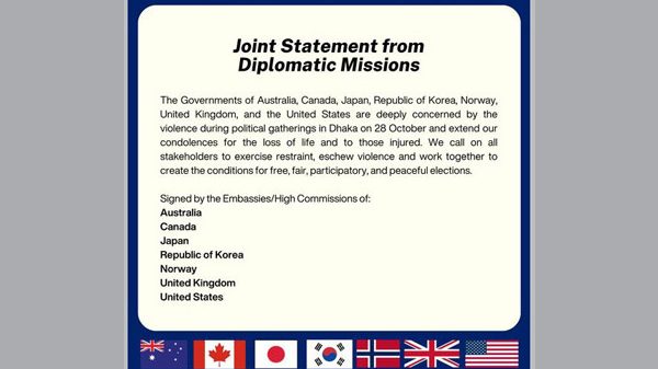 বাংলাদেশের রাজনৈতিক সহিংতায় উদ্বেগ জানিয়েছে এখানকার বিদেশী মিশনগুলো। সোমবার (৩০ অক্টোবর) এক যৌথ বিবৃতিতে এ উদ্বেগ প্রকাশ করে তারা। দেশের প্রধান বিরোধী দল বাংলাদেশ জাতীয়তাবাদী দল বিএনপির ২৮ অক্টোবরের সমাবেশ