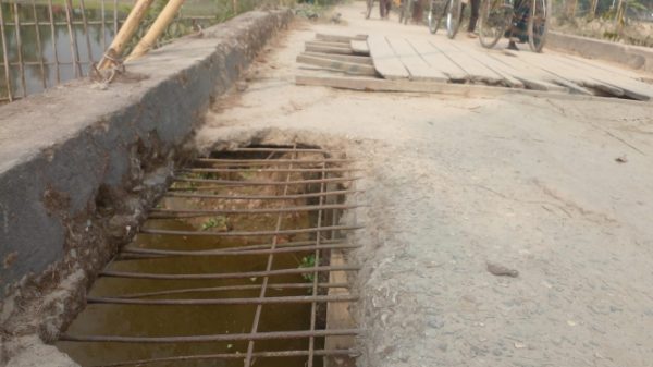 সাইফুর রহমান, শামীম,, কুড়িগ্রাম: ব্রিজ তো নয়, যেনো মরণ ফাঁদ। ব্রিজে নেই দু’পাশের রেলিং। পাটাতনের অনেক বড় জায়গাজুরে ভেঙ্গে গেছে। দেখলেই ভয়ে আঁতকে ওঠে বুক। বন্ধ রয়েছে ভারী যান চলাচলও।