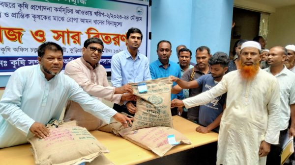 কুড়িগ্রাম)ঃ কুড়িগ্রামের ভুরুঙ্গামারীতে বিনামূল্যে আমন ধান বীজ ও সার বিতরন শুরু হয়েছে। মঙ্গলবার (১৩ জুন) দুপুরে উপজেলা কৃষি অফিস চত্ত্বরে উপজেলা কৃষি সম্প্রসারন কর্মকর্তা শাহ মোহাম্মদ আপেল মাহমুদের সভাপতিত্বে বীজ