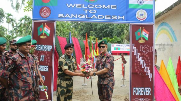 কুড়িগ্রাম প্রতিনিধি : গরু, মাদক চোরাচালান প্রতিরোধ ও অবৈধ অনুপ্রবেশ ঠেকাতে কুড়িগ্রামের ভুরুঙ্গামারী উপজেলার ধলডাংগা সীমান্তে বিজিবি ও বিএসএফ এর মধ্যে পতাকা বৈঠক অনুষ্ঠিত হয়েছে। বৃহস্পতিবার দুপুরে উপজেলার ধলডাংগা সীমান্তের