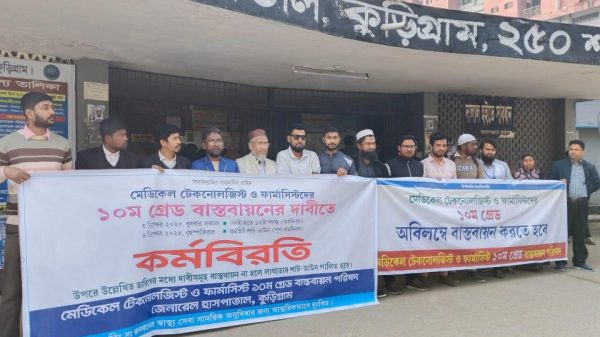 সাইফুর রহমান শামীম, কুড়িগ্রাম : কুড়িগ্রামে মেডিকেল টেকনোলজিস্ট (সকল) ও ডিপ্লোমা ফার্মাসিস্টদের ১১তম গ্রেড থেকে ১০ম গ্রেডে উন্নীতকরণের দাবিতে অর্ধদিবস কর্মবিরতি পালন করেছে ‘মেডিকেল টেকনোলজিস্ট ও ডিপ্লোমা ফার্মাসিস্ট ১০ গ্রেড