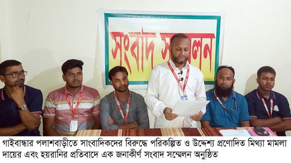 পলাশবাড়ী (গাইবান্ধা) থেকে নুরুল ইসলামঃ গাইবান্ধার পলাশবাড়ীতে সাংবাদিকদের বিরুদ্ধে পরিকল্পিত ও উদ্দেশ্য প্রণোদিত মিথ্যা মামলা দায়ের এবং হয়রানির প্রতিবাদে এক জনাকীর্ণ সংবাদ সম্মেলন অনুষ্ঠিত হয়েছে। মঙ্গলবার (৮ জুলাই) রাত সাড়ে