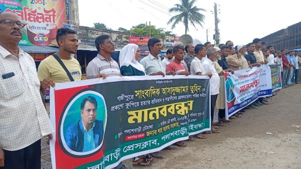 পলাশবাড়ী প্রতিনিধি ঃ গাইবান্ধার পলাশবাড়ী সাংবাদিক সমাজের আয়োজনে সাংবাদিক তুহিন হত্যার প্রতিবাদে মানববন্ধন অনুষ্ঠিত হয়েছে। ৯ আগষ্ট শনিবার দুপুরে পলাশবাড়ী পৌর শহরের চারমাথা মোড়ে সাংবাদিক সমাজের আয়োজনে সাপ্তাহিক অনর পত্রিকার