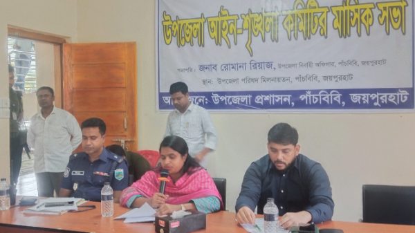 পাঁচবিবি (জয়পুরহাট) সংবাদদাতাঃ জয়পুরহাটের পাঁচবিবিতে আইন-শৃঙ্খলা কমিটির মাসিক সভা অনুষ্ঠিত হয়েছে। আজ বুধবার বেলা ১১ টায় উপজেলা প্রসাশনের আয়োজনে ও উপজেলা পরিষদ মিলনায়তনে অনুষ্ঠিত আলোচনা সভায় সভাপতিত্ব করেন উপজেলা নির্বাহী