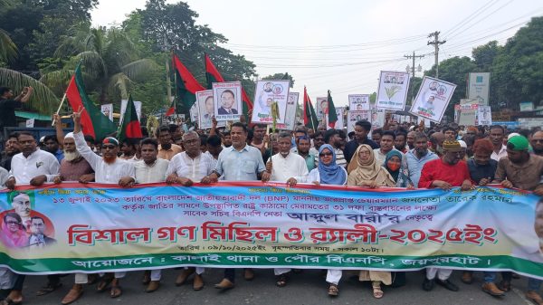 কালাই (জয়পুরহাট) প্রতিনিধি: বাংলাদেশ জাতীয়তাবাদী দল (বিএনপি) ঘোষিত ‘রাষ্ট্র কাঠামো মেরামতের ৩১ দফা’ বাস্তবায়নের দাবিতে জয়পুরহাটের কালাইয়ে গণ মিছিল ও র্যালি অনুষ্ঠিত হয়েছে। বৃহস্পতিবার দুপুরে পৌর শহর ঘুরে এই কর্মসূচির