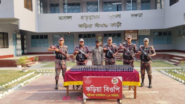 পাঁচবিবি (জয়পুরহাট) সংবাদদাতাঃ জয়পুরহাটের পাঁচবিবি সীমান্ত এলাকা থেকে ৫শ ১৩ বোতল আমদানি নিষিদ্ধ ভারতীয় ফেন্সিডিল সহ নাসিম হোসেন (২৫) নামের এক চোরাকারবারীকে আটক করেছে ১৪ ব্যাটালিয়ন বিজিবি কড়িয়া ক্যাম্পের সদস্যরা।