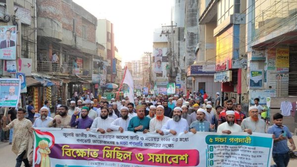 নওগাঁ প্রতিনিধি : বাংলাদেশ জামায়ােত ইসলামী নওগাঁ জেলা শাখার উদ্যোগে কেন্দ্র ঘোষিত কর্মসূচির অংশ হিসেবে জুলাই সনদের ভিত্তিতে নভেম্বরে গনভোটসহ ৫দফা দাবিতে বিক্ষোভ মিছিল ও সমাবেশ অনুষ্ঠিত হয়েছে। সোমবার বিকেল