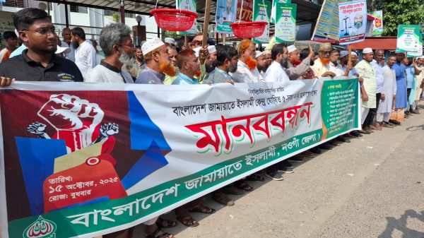 নওগাঁ প্রতিনিধি: বাংলাদেশ জামায়ােত ইসলামী নওগাঁ জেলা শাখার উদ্যোগে কেন্দ্র ঘোষিত কর্মসূচির অংশ হিসেবে ৫দফা দাবিতে মানববন্ধন অনুষ্ঠিত হয়। বুধবার সকাল ১০টায় নওগাঁ শহরের মুক্তির মোড়ে মানববন্ধনে নওগাঁ জেলা জামায়াতের