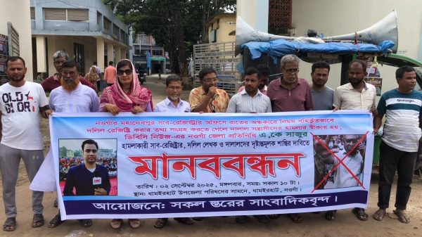 নওগাঁ প্রতিনিধি : নওগাঁর মহাদেবপুর সাবরেজিস্ট্রি অফিসে তথ্য সংগ্রহে গেলে ডিবিসি নিউজের নওগাঁ জেলা প্রতিনিধি সাংবাদিক এ.কে সাজু’র উপর হওয়া সন্ত্রাসী হামলার প্রতিবাদে জেলার ধামইরহাট উপজেলায় মানববন্ধন ও বিক্ষোভ কর্মসূচি