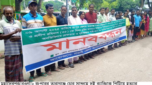 মহাদেবপুর (নওগাঁ)সংবাদদাতা : রংপুরের তারাগঞ্জে চোর সন্দেহে দলিত সম্প্রদায়ের দুই ব্যক্তিকে পিটিয়ে হত্যার প্রতিবাদে নওগাঁয় মানব বন্ধন অনুষ্ঠিত হয়েছে। গতকাল রবিবার দুপুরে জেলা প্রশাসকের কার্যালয়ের সামনে জেলা এ্যাডভোকেসী প্লাট ফরমের
