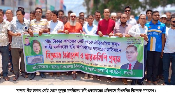 নওগাঁ প্রতিনিধি : পাঁচ টাকার নোট থেকে ঐতিহাসিক কুসুম্বা শাহী মসজিদের ছবি প্রত্যাহারের সিদ্ধান্তের প্রতিবাদে নওগাঁর মান্দা উপজেলা বিএনপির উদ্যোগে বিক্ষোভ সমাবেশ ও স্মারকলিপি প্রদান করা হয়েছে। আজ মঙ্গলবার বেলা