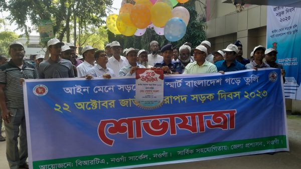 নওগাঁ প্রতিনিধি: ‘আইন মেনে সড়কে চলি, স্মার্ট বাংলাদেশ গড়ে তুলি’ প্রতিপাদ্যে নওগাঁয় জাতীয় নিরাপদ সড়ক দিবস উপলক্ষে শোভাযাত্রা ও আলোচনা সভা অনুষ্ঠিত হয়েছে। রোববার সকাল সাড়ে ৯টায় বেলুন ও ফেস্টুন