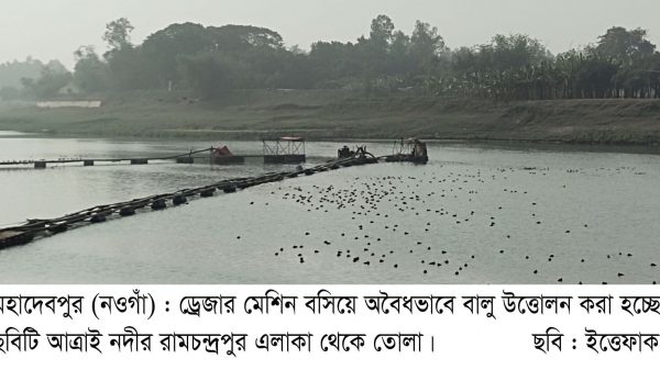 মহাদেবপুর (নওগাঁ) সংবাদদাতা: নওগাঁর মহাদেবপুরে আত্রাই নদীর রামচন্দ্রপুর এলাকায় ড্রেজার মেশিন বসিয়ে অবৈধভাবে বালু উত্তোলনের অভিযোগ উঠেছে। এতে হুমকীর মুখে পড়েছে নদী তীরবর্তী রামচন্দ্রপুর সরকারি প্রাথমিক বিদ্যালয়সহ কয়েকশ একর কৃষি