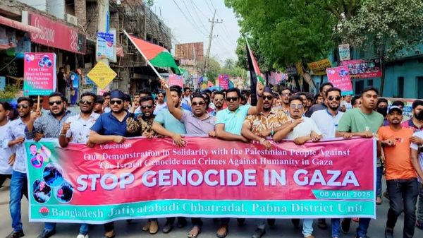 পাবনা প্রতিনিধি: ফিলিস্তিনিদের উপর ইসরাইলের গণহত্যার প্রতিবাদে এবং ফিলিস্তিনি জনগণের প্রতি সংহতি জানিয়ে পাবনায় বিক্ষোভ মিছিল ও প্রতিবাদ সমাবেশ করেছে জেলা ছাত্রদল ও তার অঙ্গ সহযোগী সংগঠন। মঙ্গলবার (০৮ এপ্রিল)