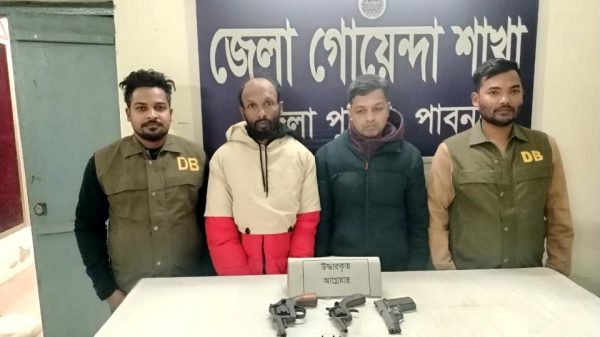 পাবনা প্রতিনিধি: পাবনা শহরে গোয়েন্দা পুলিশের (ডিবি) বিশেষ অভিযানে তিনটি অস্ত্র বিপুল পরিমাণ গুলি সহ চারজনকে আটক করা হয়েছে। বুধবার (০১ জানুয়ারি) রাতে শহরের বিভিন্ন স্থানে অভিযান চালিয়ে তাদের আটক