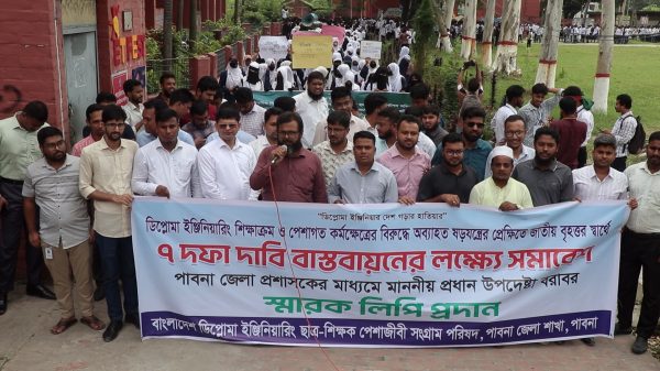 পাবনা প্রতিনিধি: সাত দফা দাবিতে পাবনায় বাংলাদেশ ডিপ্লোমা ইঞ্জিনিয়ারিং ছাত্র-শিক্ষক-পেশাজীবী সংগ্রাম পরিষদের বিক্ষোভ সমাবেশ ও স্মারকলিপি প্রদান অনুষ্ঠিত হয়েছে। বুধবার (১০ সেপ্টেম্বর) সকাল সাড়ে এগারোটায় বাংলাদেশ ডিপ্লোমা ইঞ্জিনিয়ারিং ছাত্র-শিক্ষক পেশাজীবী