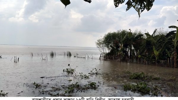 মাসুদ রানা রাব্বানী, রাজশাহী: রাজশাহীর বাঘা উপজেলার চকরাজাপুর ইউনিয়নের চৌমাদিয়া চরে পদ্মার ভয়াবহ ভাঙনে গত এক সপ্তাহের ব্যবধানে ১৫টি বসতভিটা বিলীন হয়ে গেছে। চোখের নিমিষেই বাড়িঘরগুলো পদ্মার গর্ভে হারিয়ে যাওয়ায়