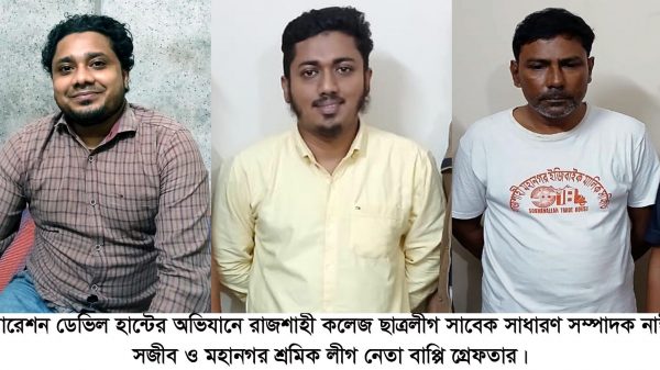 মাসুদ রানা রাব্বানী, রাজশাহী: অপারেশন ডেভিল হান্টের অভিযানে রাজশাহী কলেজ ছাত্রলীগ সাবেক সাধারণ সম্পাদক নাঈম (৩১), ছাত্রলীগ নেতা সজীব (৩২) ও মহানগর শ্রমিক লীগ নেতা বাপ্পি (৪৯) সহ ১৯ জনকে
