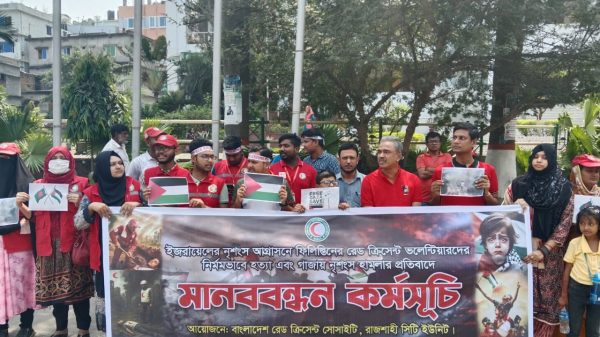মাসুদ রানা রাব্বানী, রাজশাহী: রাজশাহীতে বাংলাদেশ রেড ক্রিসেন্ট সোসাইটি রাজশাহী সিটি ইউনিটের উদ্যোগে ইজরাইলের নৃশংস আগ্রাসনে ফিলিস্তিনের রেড ক্রিসেন্ট ভলেন্টিয়ারদের নির্মমভাবে হত্যা এবং নৃশংস হামলার প্রতিবাদে মানববন্ধন কর্মসূচি পালন করা