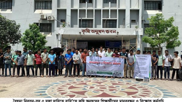 মাসুদ রানা রাব্বানী, রাজশাহী: বিএসসি কৃষিবিদদের প্রতি বৈষম্য নিরসন-সহ পাঁচ দফা দাবিতে সারাদেশের মতো রাজশাহী বিশ্ববিদ্যালয়ে (রাবি) মানববন্ধন ও বিক্ষোভ সমাবেশ করেছে কৃষি অনুষদের শিক্ষার্থীরা। বুধবার (২৩ এপ্রিল) সকাল ১০টায়