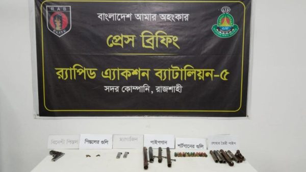 মাসুদ রানা রাব্বানী, রাজশাহী: রাজশাহীর তানোরে পরিত্যক্ত অবস্থায় গুলিসহ ১টি বিদেশী পিস্তল ও বিপুল পরিমান পাইপগান উদ্ধার করেছে র্যাব। রোববার (২৮ ডিসেম্বর) দিবাগত রাত সাড়ে ১২টা হতে পোনে ২টা পর্যন্ত