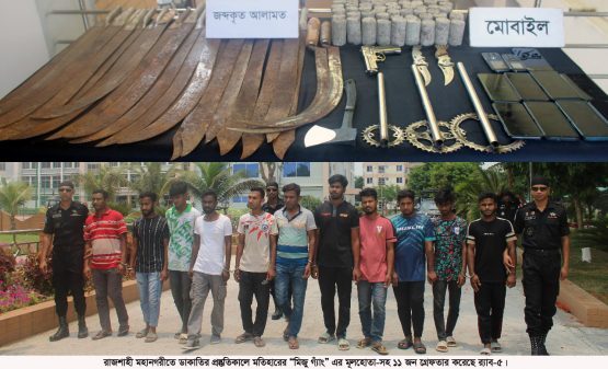 মাসুদ রানা রাব্বানী, রাজশাহী: রাজশাহী মহানগরীতে ডাকাতির প্রস্তুতিকালে “মিজু গ্যাঁং” এর মূলহোতাসহ ১১ জনকে গ্রেফতার করেছে র্যাব-৫। বুধবার (১৫ মে) দিনগত রাত দেড়টায় মহানগরীর চন্দ্রিমা থানাধীন ছোটবনগ্রাম এলাকায় অস্ত্র-শস্ত্রে সজ্জিত