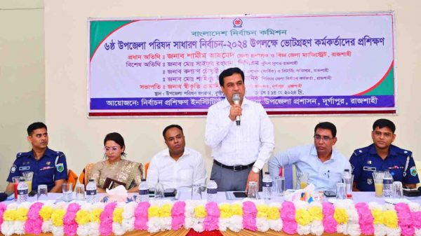 মাসুদ রানা রাব্বানী, রাজশাহী: রাজশাহীতে ষষ্ঠ উপজেলা নির্বাচনের তৃতীয় ধাপে দূর্গাপুর উপজেলা পরিষদ নির্বাচন উপলক্ষে ১ হাজার ৫৬৩ জন ভোট গ্রহণ কর্মকর্তাদের প্রশিক্ষণ কর্মশালা অনুষ্ঠিত হয়েছে। মঙ্গলবার (১৪ মে) সকালে