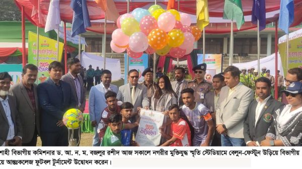 মাসুদ রানা রাব্বানী, রাজশাহী: রাজশাহী মুক্তিযুদ্ধ স্মৃতি স্টেডিয়ামে যুব ও ক্রীড়া মন্ত্রণালয়ের আয়োজনে বিভাগীয় প্রশাসন ও জেলা ক্রীড়া অফিসের বাস্তবায়নে বিভাগীয় পর্যায়ে আন্তঃকলেজ ফুটবল টুর্নামেন্ট উদ্বোধন করা হয়েছে। বৃহস্পতিবার (১৮