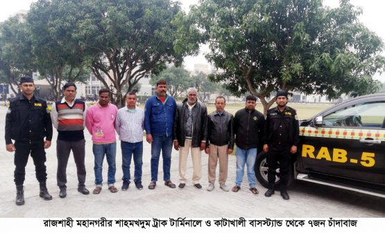 মাসুদ রানা রাব্বানী, রাজশাহী: রাজশাহী মহানগরীর শাহমখদুম ট্রাক টার্মিনালে ৪জন ও কাটাখালী বাসস্ট্যান্ড থেকে ৩জন মোট ৭জন চাঁদাবাজ চক্রের সদস্যকে গ্রেফতার করেছে র্যাব। রবিবার (৪ ফেব্রুয়ারি) বিকাল সাড়ে ৪টায় মহানগরীর