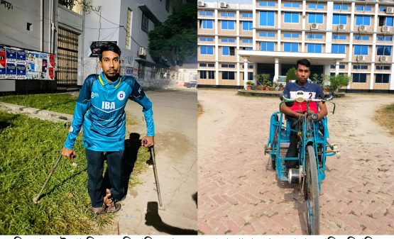 মাসুদ রানা রাব্বানী, রাজশাহী: বিকলাঙ্গ দু’টি পা। মেরুদণ্ডের হাড়টাও বাঁকা। সোজা হয়ে বসতে পারেন না ঠিকমতো। জন্মলগ্ন থেকেই নিয়তি তাকে সঙ্গ দেয়নি। জন্মটাও দারিদ্র্য পরিবারে। তবে তার অদম্য ইচ্ছাশক্তি ও