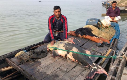 মাসুদ রানা রাব্বানী, রাজশাহী: রাজশাহীর পদ্মা নদীতে ৫৫ কেজি ওজনের একটি বাঘাইড় মাছ ধরা পড়েছে। শুক্রবার ভোরে রাজশাহী নগরীর ধরমপুর জাহাজঘাট এলাকার পদ্মা নদীতে থেকে মাছটি ধরা পড়ে। শুক্রবার ভোরবেলায়