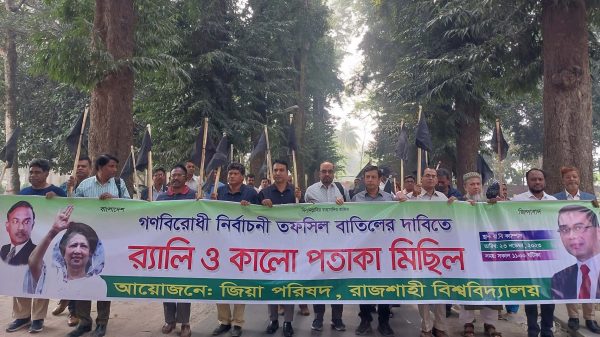 মাসুদ রানা রাব্বানী, রাজশাহী: রাজশাহী বিশ্ববিদ্যালয়ে (রাবি) র্যালী ও কালো পতাকা মিছিল করেছে বিশ্ববিদ্যালয় জিয়া পরিষদ। নির্বাচনী তফসিল বাতিলের দাবিতে এ মিছিল করেছেন তাঁরা। বৃহস্পতিবার (২৩ নভেম্বর) বেলা ১১টায় বিশ্ববিদ্যালয়ের