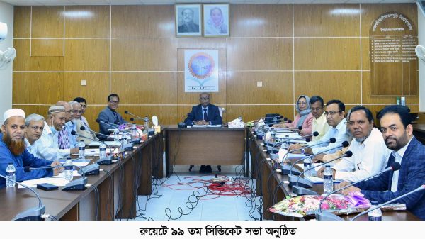 মাসুদ রানা রাব্বানী, রাজশাহী: রাজশাহী প্রকৌশল ও প্রযুক্তি বিশ্ববিদ্যালয়ে (রুয়েট) সিন্ডিকেট কমিটির ৯৯ তম সভা অনুষ্ঠিত হয়েছে। বৃহস্পতিবার সকালে বিশ্ববিদ্যালয়ের কনফারেন্স রুমে এই সিন্ডিকেট সভা অনুষ্ঠিত হয়। সভায় সভাপতিত্ব করেন
