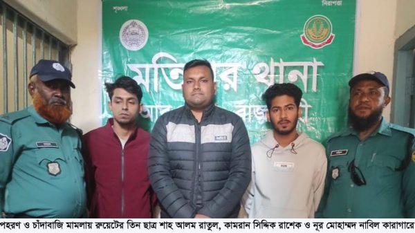 মাসুদ রানা রাব্বানী, রাজশাহী: অপহরণ ও চাঁদাবাজি মামলায় রাজশাহী প্রকৌশল ও প্রযুক্তি বিশ্ববিদ্যালয়ের (রুয়েট) তিন ছাত্রকে কারাগারে পাঠানো হয়েছে। গ্রেফতাররা হলেন- শাহ আলম রাতুল, কামরান সিদ্দিক রাশেক এবং নূর মোহাম্মদ