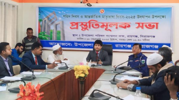 আমিনুল ইসলাম হিরো, সিরাজগঞ্জ : সিরাজগঞ্জের রায়গঞ্জে শহীদ দিবস ও আন্তর্জাতিক মাতৃভাষা দিবস উদযাপন উপলক্ষে প্রস্তুতিমূলক সভা অনুষ্ঠিত হয়েছে। মঙ্গলবার সকাল ১১ টার দিকে উপজেলার সভাকক্ষে উপজেলা নির্বাহী কর্মকর্তা মো.