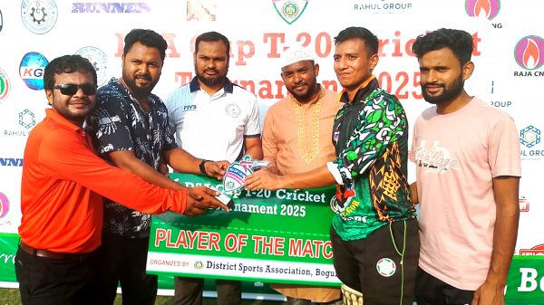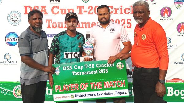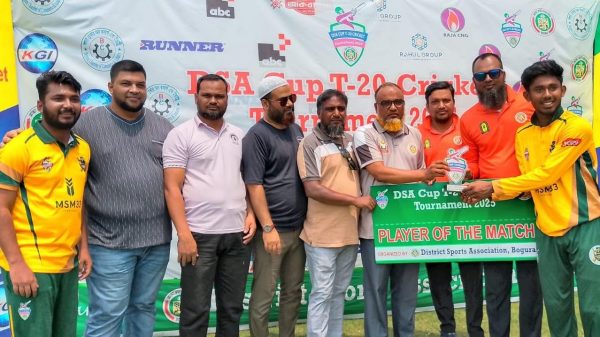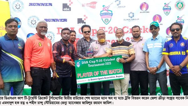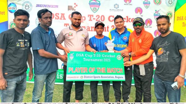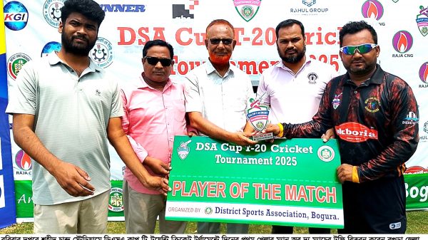 বগুড়া জেলা ক্রীড়া সংস্থার আয়োজনে শহীদ চান্দু স্টেডিয়ামে অনুষ্ঠানরত ‘ডিএসএ কাপ টি-টুয়েন্টি ক্রিকেট টুর্ণামেন্টে’র দ্বিতীয় রাউন্ডের প্রথম ম্যাচে সোনারগাঁ স্পোর্টিং ক্লাব ৩ উইকেটে রসুল স্মৃতি সংঘকে পরাজিত করে সেমিফাইনালে উন্নীত