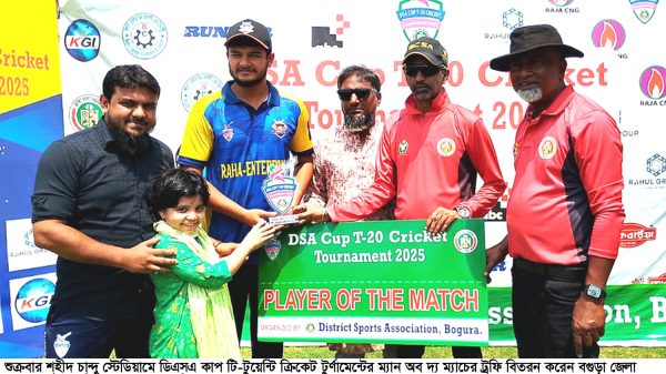 বগুড়া জেলা ক্রীড়া সংস্থার আয়োজনে শহীদ চান্দু স্টেডিয়ামে অনুষ্ঠাানরত ডিএসএ কাপ টি-টুয়েন্টি ক্রিকেট টুর্ণামেন্টের বৃহস্পতিবারের খেলায় মেঘদ্বীপ ক্রীড়া চক্র ৯ উইকেটে ইয়ং এক্সপ্রেসকে এবং ইয়ং টাইগার্স ক্রিকেট একাডেমী ১১৩ রানের