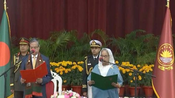 টানা চতুর্থ মেয়াদের জন্য প্রধানমন্ত্রী হিসেবে শপথ নিলেন আওয়ামী লীগ সভাপতি শেখ হাসিনা। সন্ধ্যায় বঙ্গভবনে প্রধানমন্ত্রী হিসেবে তাকে শপথবাক্য পাঠ করান প্রেসিডেন্ট মো. সাহাবুদ্দিন। শপথ গ্রহণের মধ্য দিয়ে প্রধানমন্ত্রী হিসেবে