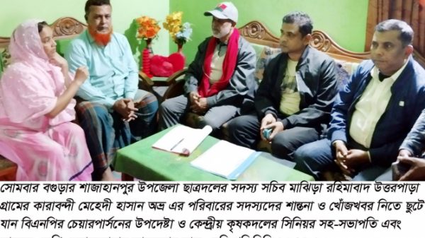গাবতলী (বগুড়া) প্রতিনিধিঃ সোমবার (২৫শে ডিসেম্বর২৩) বগুড়ার শাজাহানপুরের কারাবন্দী ৬পরিবারের সদস্যদের শান্তনা ও খোঁজখবর নিতে গিয়ে নগদ আর্থিক সহায়তা প্রদান করেন বিএনপির চেয়ারপার্সনের উপদেষ্টা ও কেন্দ্রীয় কৃষকদলের সিনিয়র সহ-সভাপতি এবং